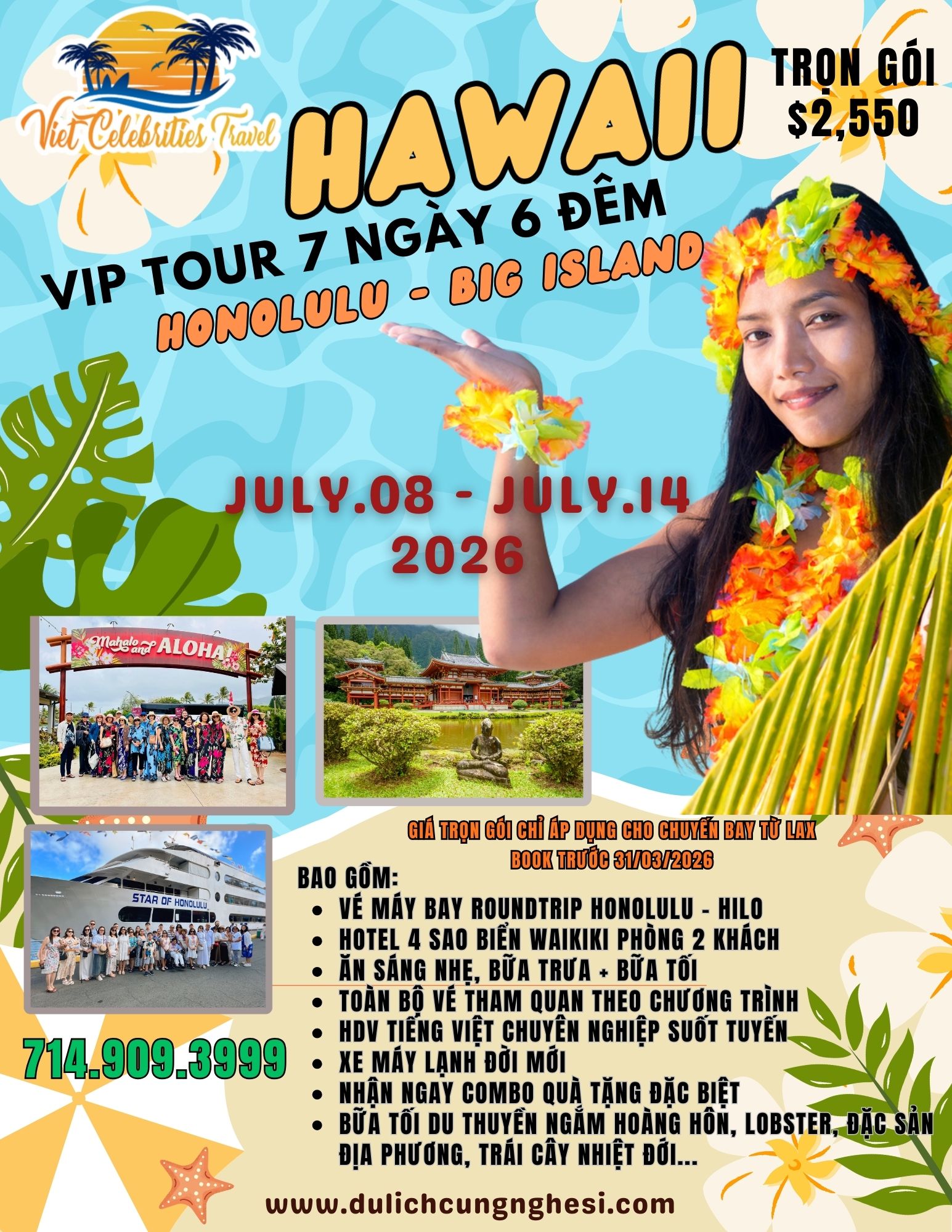 Giá trọn gói chỉ: $5,950 ( Giá áp dụng cho khách book trước 31/12/2025 Khởi hành từ LAX, các tiểu bang khác giá sẽ thay đổi tuỳ thuộc vào giá vé máy bay)