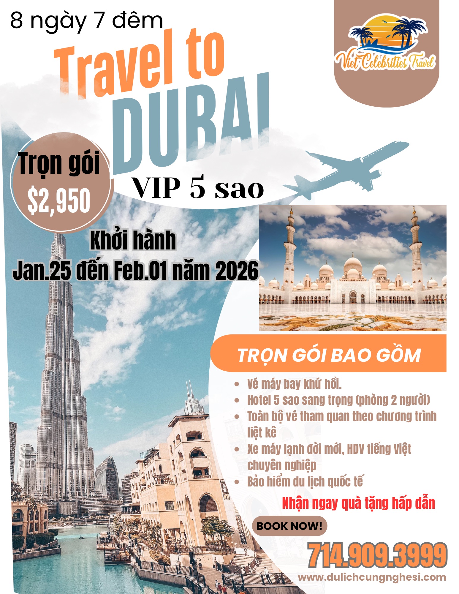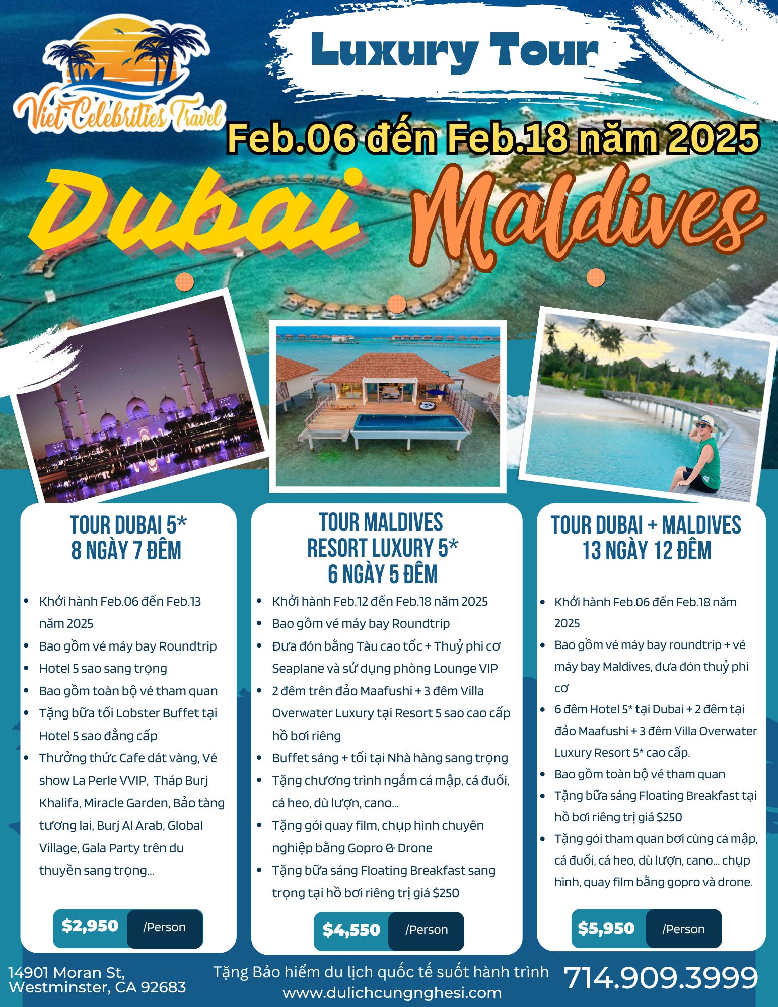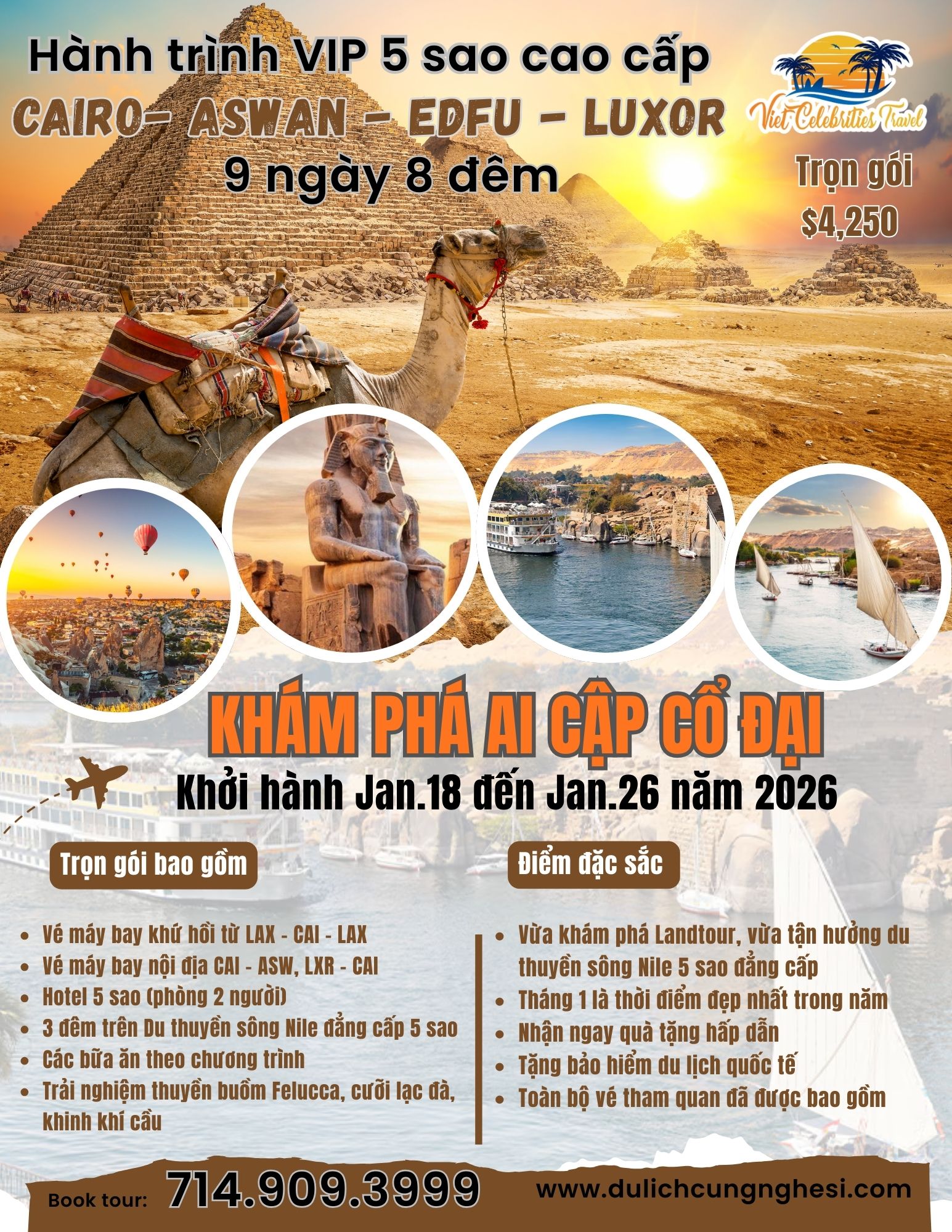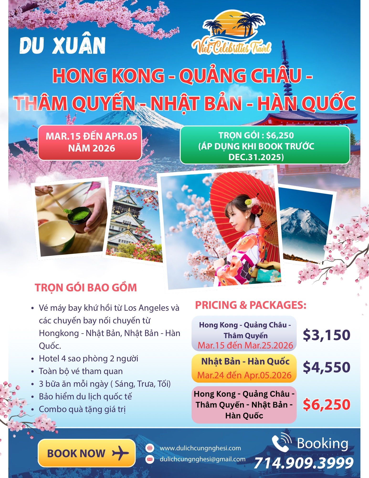 Giá trọn gói chỉ: $5,950 ( Giá áp dụng cho khách book trước 31/12/2025 Khởi hành từ LAX, các tiểu bang khác giá sẽ thay đổi tuỳ thuộc vào giá vé máy bay)