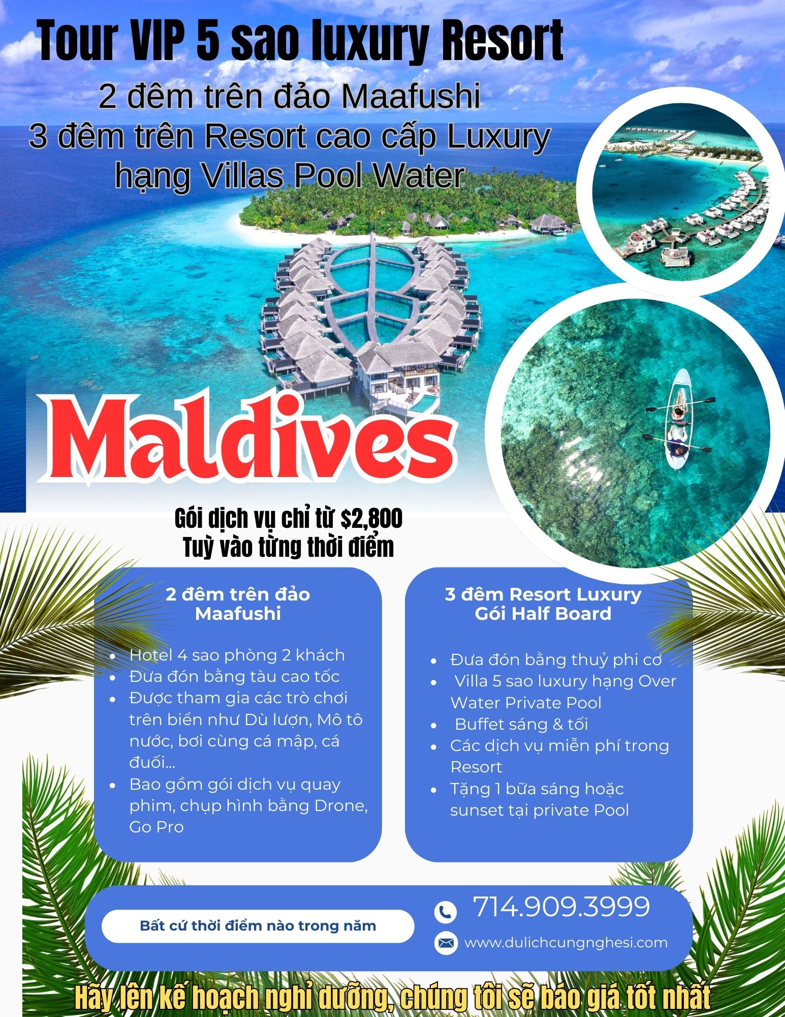 Giá dịch vụ tuỳ vào thời điểm book tour. Quý khách có thể chọn thời gian muốn nghỉ dưỡng và liên lạc trực tiếp 714.909.3999 để được tư vấn lựa chọn Resort quý vị yêu thích
